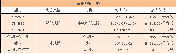 裕森地板品種全,花色多,產品系列有原木印象(強化地板)系列、原木原味(實木平面)系列、裕臻實木(實木復合)系列、歐卡拉匠心坊(實木仿古)系列、歐調藝術(實木拼花)系列、珍木堂(實木地板)、全能王(純實木地熱)系列等七大產品系列。