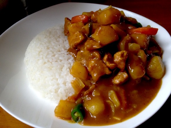 咖喱飯按理該用盤子吃的。盛半盤上好米飯,上面澆上幾勺咖喱鹵,真是香氣四溢,誘人食欲。