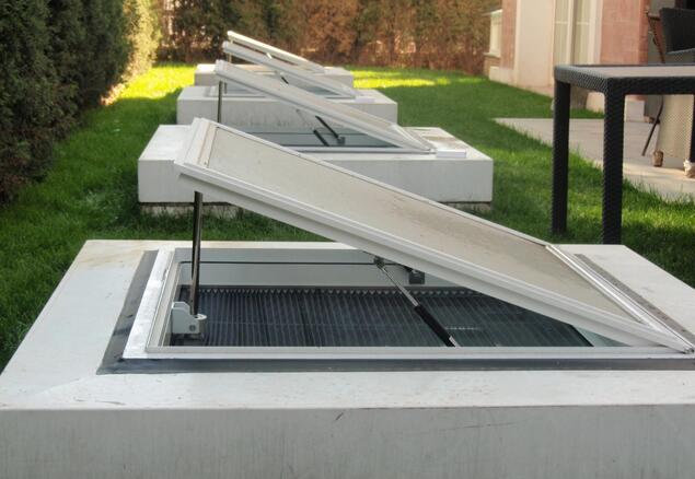 地下采光窗主要有中懸和上懸兩種方式保持地下室的通風(fēng)換氣,很好的彌補(bǔ)了全玻璃封閉式保持采光卻放棄通風(fēng)功能的設(shè)計(jì)不足。開(kāi)鉸鏈的設(shè)計(jì)模式控制開(kāi)窗角度在30度以?xún)?nèi),有效避免不小心踩踏掉落的危險(xiǎn)。
