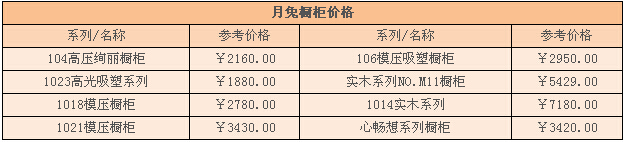 月兔櫥柜是性價比應該還是可以的,具體價格要視不同型號、板材、廚電、五金配件等多方面決定,一般中檔的月兔櫥柜價格在1800~3700元之間,高檔的會達到3萬元。