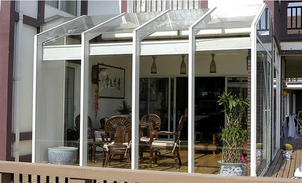 構造構成:立面采用單玻塑鋼窗(或許雙玻塑鋼窗),頂面采用彩鋁方管框架連系8mm鋼化玻璃(或許5+5夾膠玻璃,5+5單面鋼化夾膠璃,5+5雙面鋼化夾膠玻璃)。